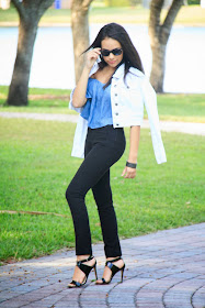 Crop top: GUESS   Denim Jacket: Topshop   Pants: H&M (very similar here)   Heels: Charles David (similar style here)   Sunnies: Ray-Ban   Bangles: Target